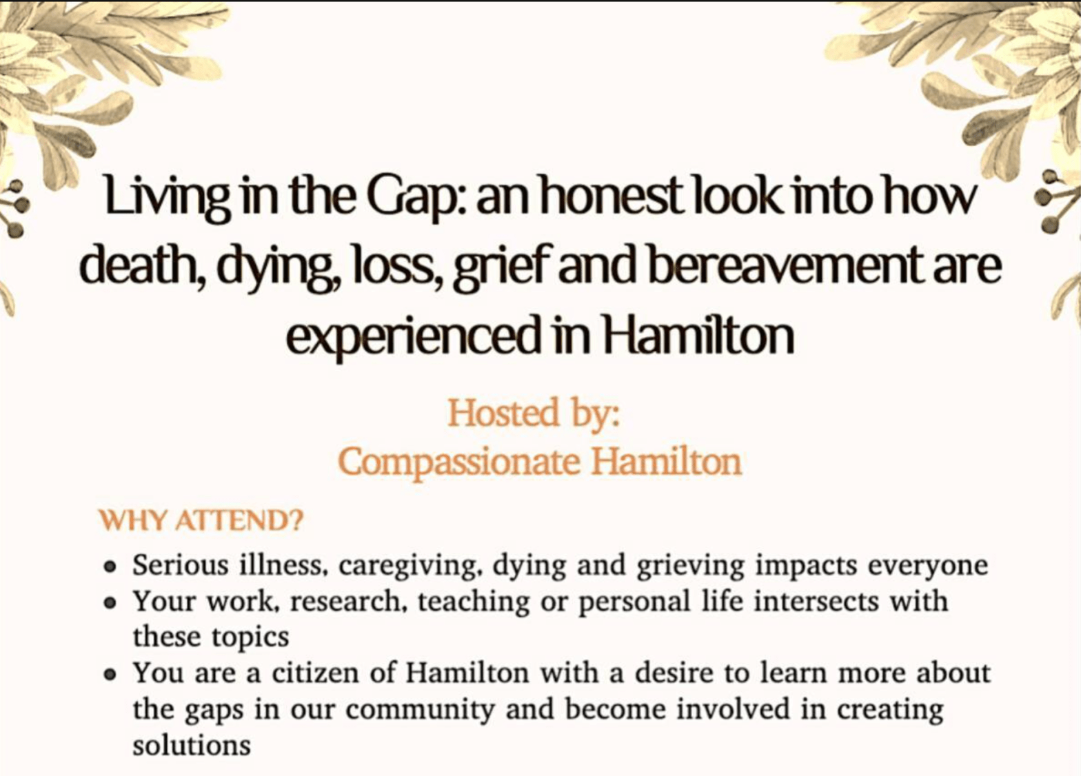 Gallagher said the event will hinge on three questions: How is death, dying and loss experienced in Hamilton? What are the gaps? And what are some of the potential solutions?